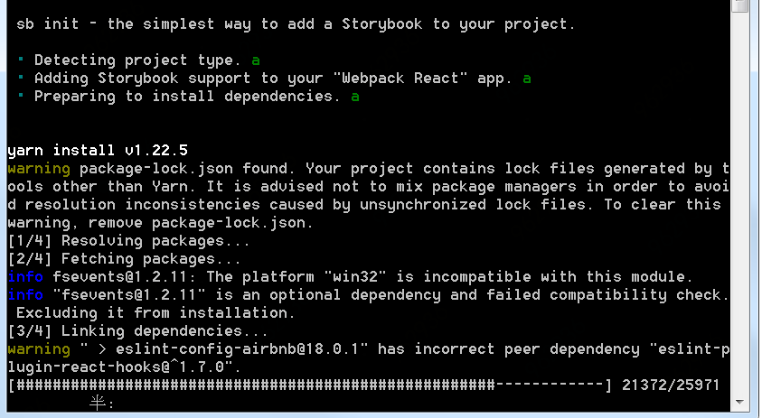 在已有项目命令行执行$ npx sb init 此操作命令根据你当前的package.json文件自动配置需要的storybook环境,包括适配TS的一些配置。安装大概需要3分钟。安装完成后,就可以看到命令行窗口提示: