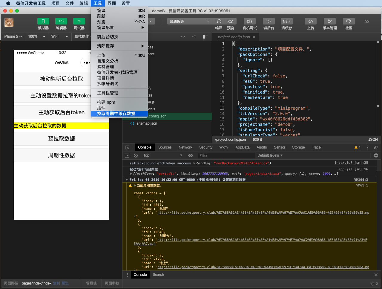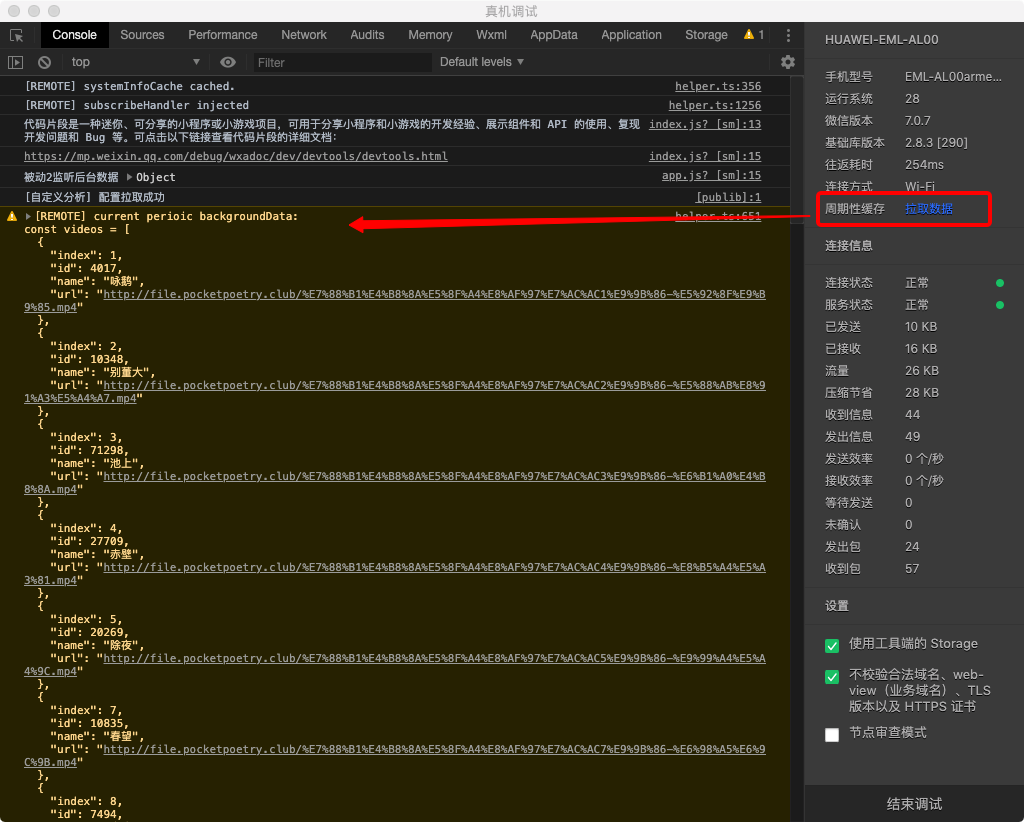 由于微信客户端每隔 12 个小时才会发起一次请求,调试周期性更新功能会显得不太方便。 目前新增能够在开发者工具上调试整个流程,操作路径为点击菜单 工具 -> 拉取周期性缓存数据, 点击后开发者工具会立即向配置的数据下载地址请求数据,如下图所示: