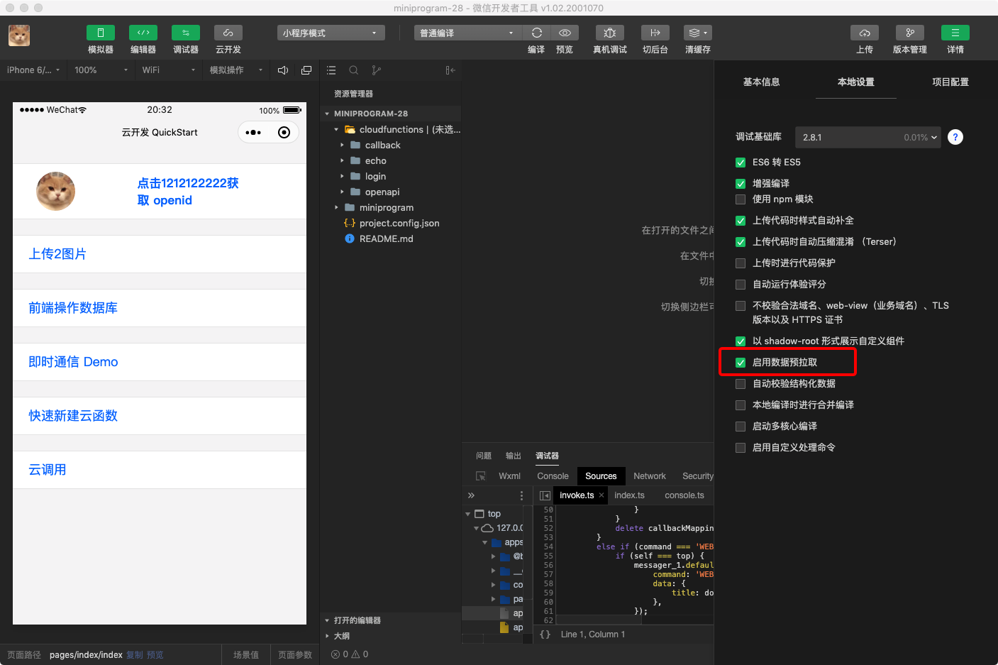 目前在新版开发者工具(1.02.1911202及以上版本)本地设置中新增设置 启用数据预拉取, 设置后开发者工具会在小程序运行时向用户配置的预拉取数据下载地址请求数据,如下图所示: