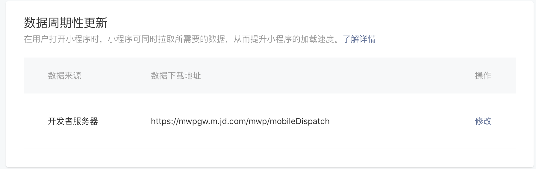 登录小程序 MP 管理后台,进入设置 -> 开发设置 -> 数据周期性更新,点击开启,填写数据下载地址。